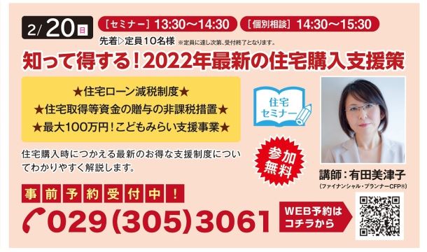 2月20日(日)にハウジングギャラリー水戸でセミナー&相談会を行います。 テーマは2022年度の住宅購入支援策です。 今年から大きく変わった「住宅ローン減税」 親御さん...