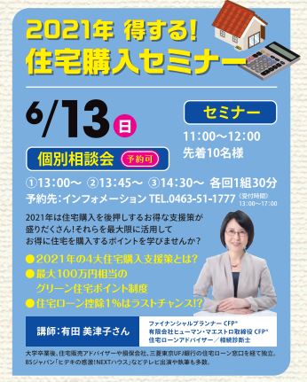 6月13日(日)tvkハウジングプラザ湘南平塚でセミナー&相談会を行います。 11:00~12:00 2021年4大住宅購入支援策 セミナー 相談会 ①13:00~ ②13:45~...