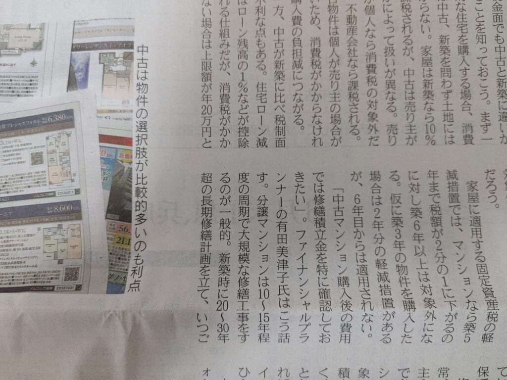 日経新聞「マネーのまなび」に中古マンション購入のコメントが掲載されました