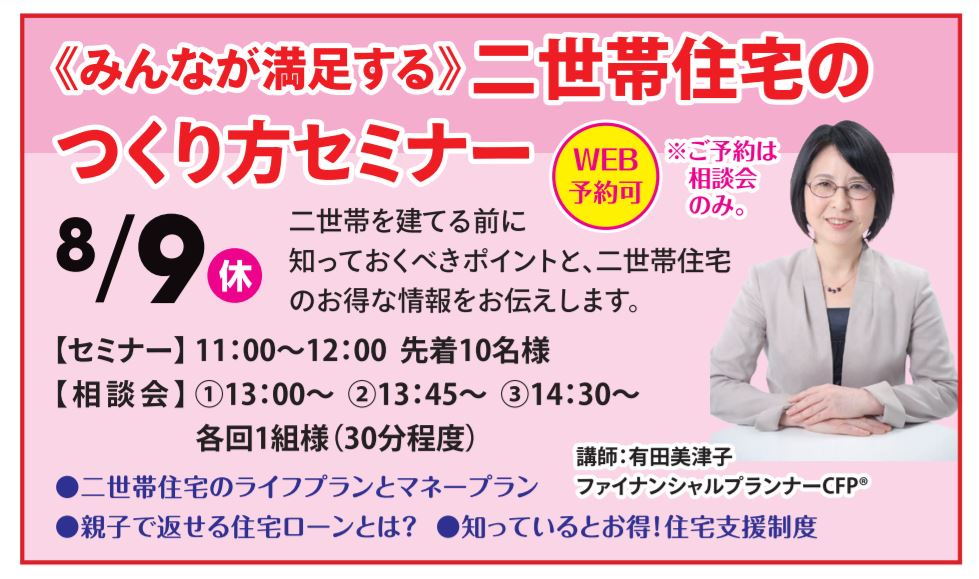 8月9日は湘南平塚で二世帯住宅のつくり方セミナーです