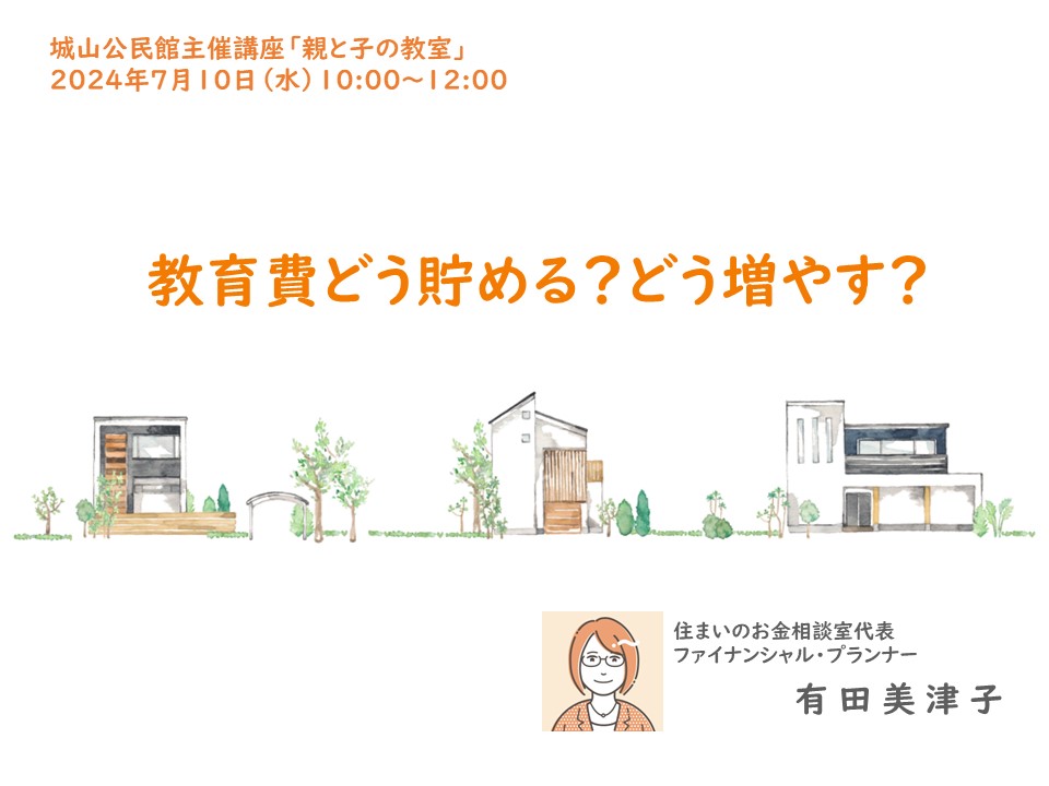 7月10日に稲城市城山公民館主催の「親と子の教室」で教育費の貯め方・増やし方講座を行います。 保育付きで毎回すぐに満席となる講座です。 昨年度からご縁をいただき、...