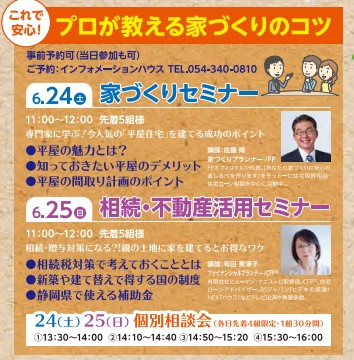 6月25日(日)11時から静岡市「葵住宅公園」で「相続・不動産活用セミナー」を行います。