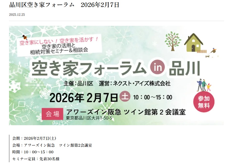 2月7日(土)13時より「空き家フォーラムin品川」に登壇します。