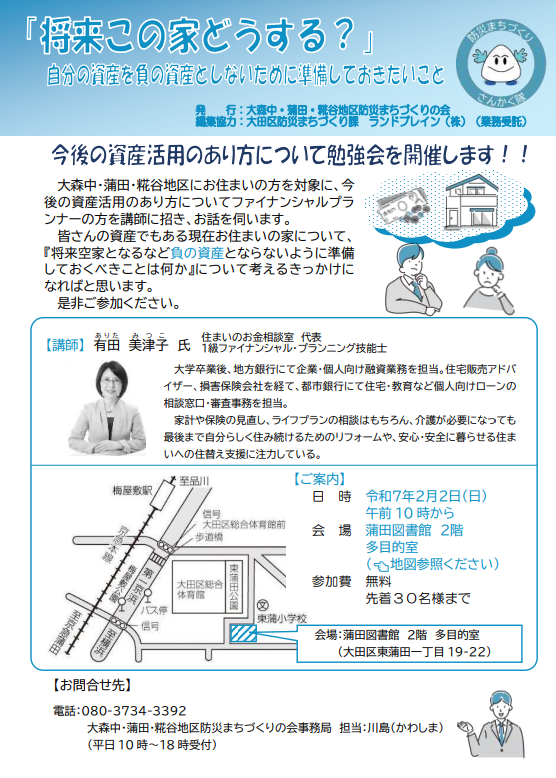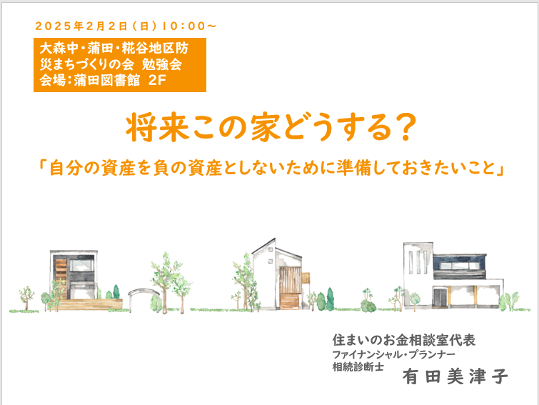 東日本大震災の翌年、2012年に始まった「東京都の木密地域不燃化10年プロジェクト」10年が過ぎてからも、災害に強い街づくりのために、地域でコツコツと勉強会を続けている地域の「防災まちづくりの会」自宅資産の活用について、また認知症になっても自分の資産を自分や家族のために使えるように、どのような準備が必要かをお話させていただきました。