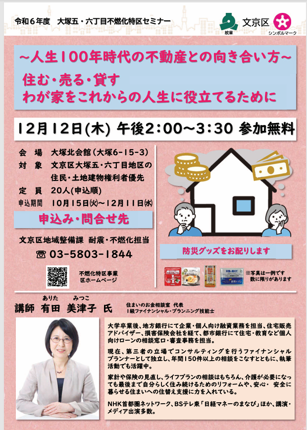 このようなご縁のある木密プロジェクトですが、12月12日にご縁があって、文京区大塚5・6丁目地区の皆様に向けて、資産価値の高いご自宅を自分のため、次の世代のためにしっかりと活かしていこう、という趣旨の講演をさせていただきました。